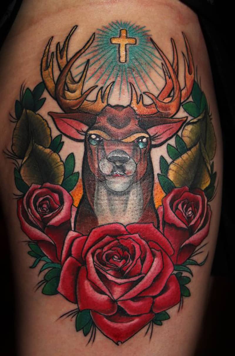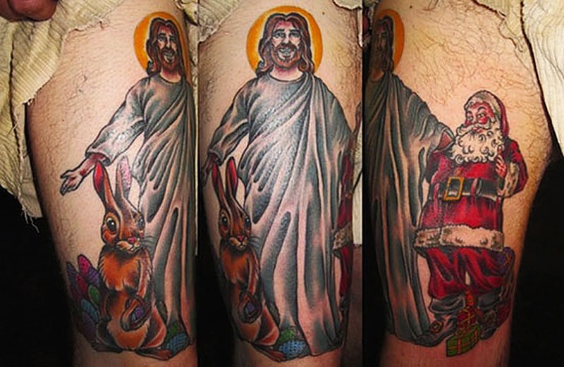 Both Jesus and Santa get a look in with this wonderful religious tattoo that combines Jesus Christ body art with a tattoo of Father Christmas himself. I guess this is a holy tattoo with a fun festive twist. Rich, bold colors depict Santa Claus and Jesus in this amazing example of festive body art.