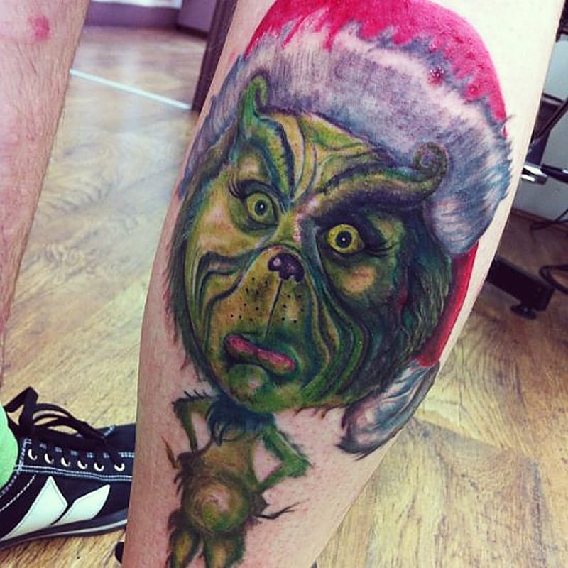 Who could forget the Grinch at Christmas time. This marvellous leg tattoo depicts one of the festive seasons most popular characters, namely the Grinch. The Grinch tattoo is a full leg inking and employs the strong green inks and colors that we associate with the Grinch. A striking piece of festive body art.