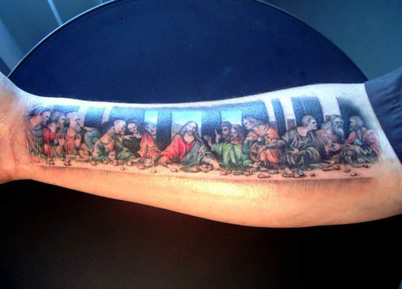 This amazing piece of religious body art depicts the famous scene of the Last Supper. The Last Supper tattoo being a landscape orientation runs from one end of the forearm to the other. This is an incredible religious tattoo design. Even though the tattoo artist would have been able to copy from source the level of detail in this Christmas tattoo design is astonishing.