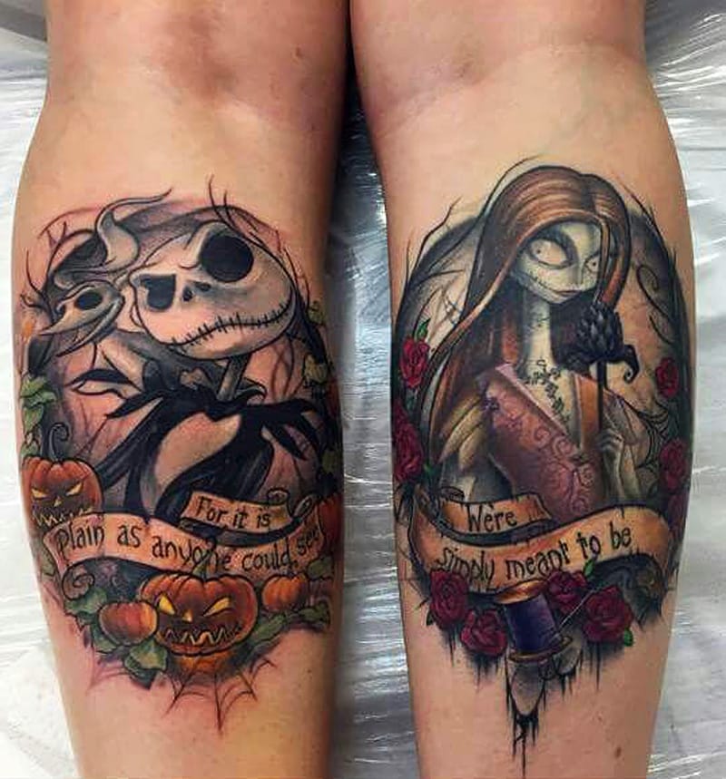This Nightmare Before Christmas themed tattoo is a scary way to celebrate the festive season. This a double set leg Christmas tattoo design depicting popular characters from The Nightmare Before Christmas. Strong colors and contrasting characters are a signature of this particular Christmas themed leg tattoo design.