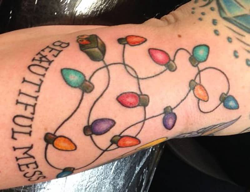 The Christmas lights are an important part of the Christmas holiday season. Whether the lights be decorating the Christmas tree or decorating a leg or arm. As is the case here with this expressive festive lights tattoo design. Christmas lights require colorful body art and this decorative tattoo is no exception.